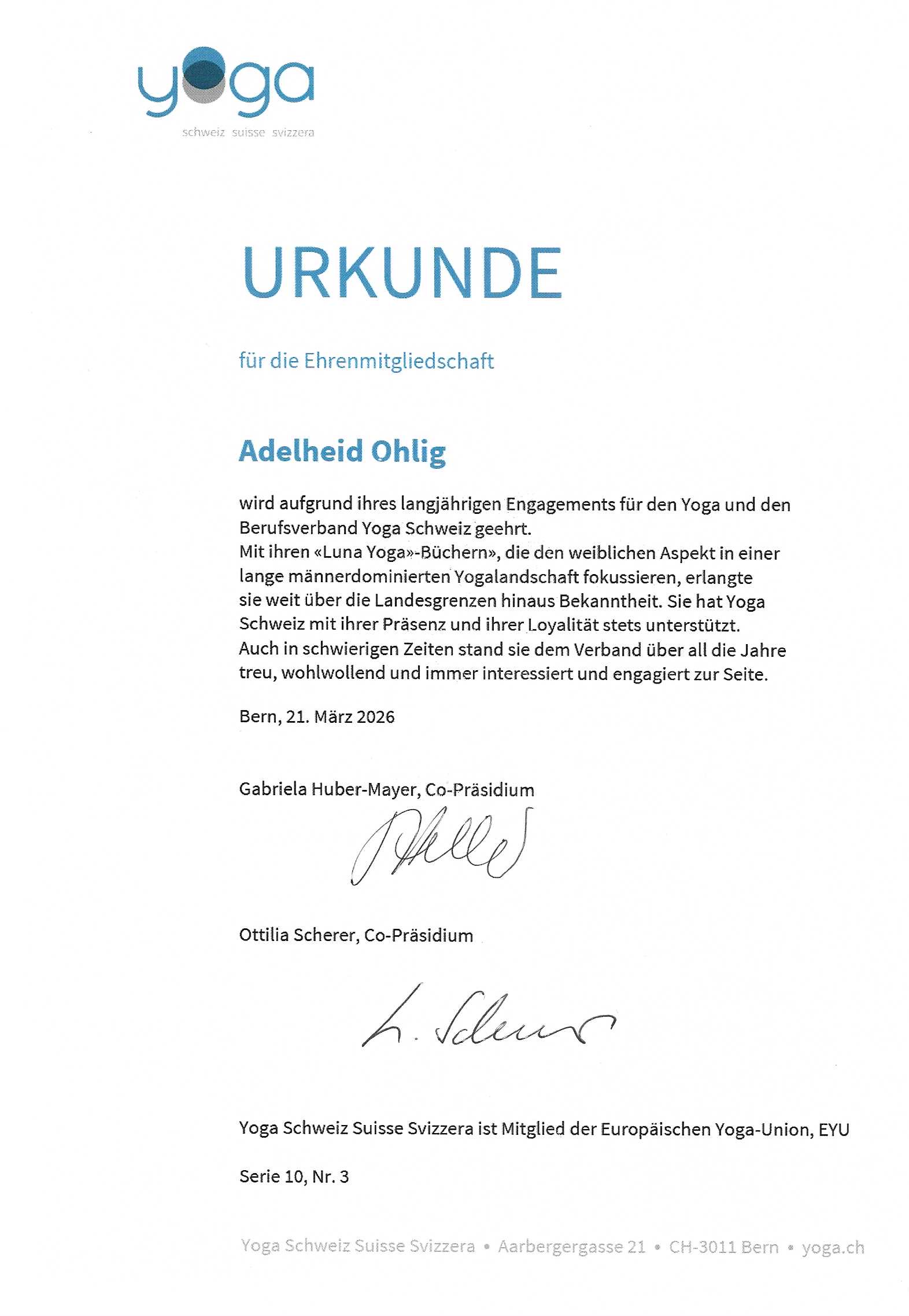 Am Frühlingsbeginn wurde ich zum Ehrenmitglied von Yoga Schweiz ernannt. Ich fühle mich geehrt, gewürdigt und bin dankbar.