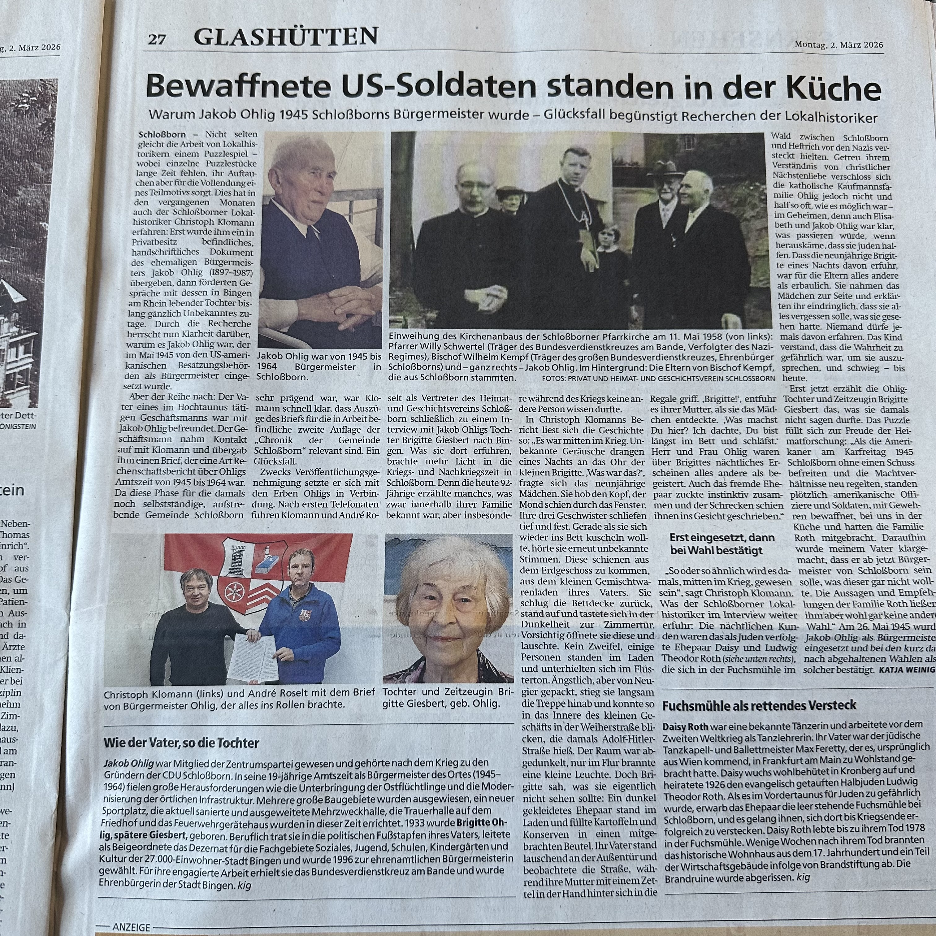 Meine grosse Schwester, zwölf Jahre vor mir geboren, hat natürlich ganz andere Erinnerungen an ihre Kindheit als ich. Kürzlich wurde sie von den Lokalhistorikern unseres Heimatorts Schlossborn zur Kriegs- und Nachkriegszeit befragt. Die Taunuszeitung griff diese Recherche Anfang März auf und berichtete darüber, wie unser Vater 1945 von den US-Amerikanern als unbescholtener Bürger zum Bürgermeister ernannt wurde. Woraufhin er – da die Menschen ihm gern bei den Wahlen ihre Stimme gaben – bis Anfang 1965 dieses Amt ausübte. Hier der Bericht der Zeitung: